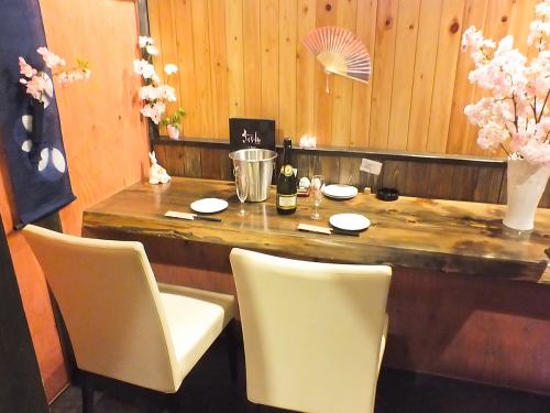 横並びの2名様のカウンタータイプの席です。個室になっててカップルシートとして使える人気の席です。対面で座るより、ぐっと距離が縮まるかも?